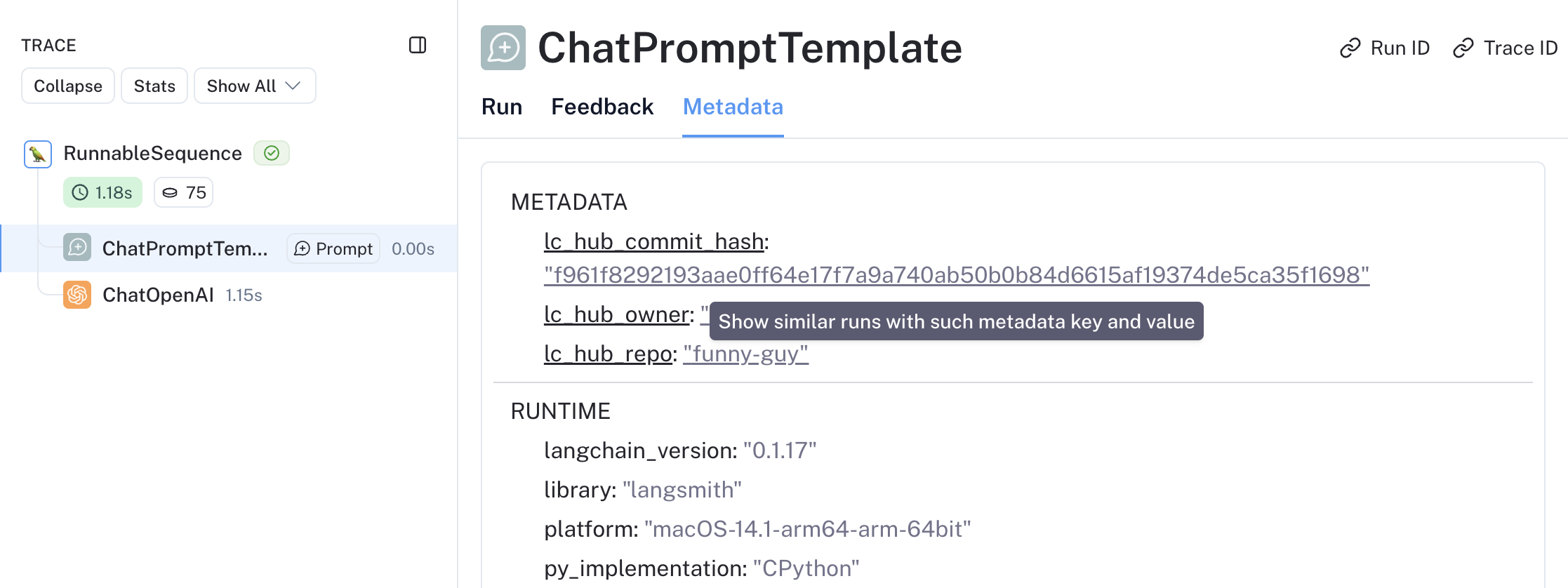 In the metadata of the run, you can see more details. Click on an individual prompt metadata value to filter your traces by that attribute. You can filter by prompt handle, prompt name, or prompt commit hash.
